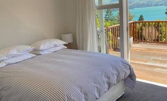 The main house features a master bedroom (queen bed), a fully equipped kitchen, dining and lounge spaces that all overlook the harbour. The doors open onto the huge deck that has an unrivaled view across the Akaroa bays. There is not a better spot to barbeque some delicious sausages from the fantastic local butcher in all Aotearoa.
