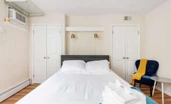 Comes with a new commercial bed with a Casper mattress, a beautiful dresser with six drawers, a comfortable loveseat, moon lamp, and other amenities. This room is perfect for a couple's retreat or a comfortable night sleep and it has plenty of storage space for your belongings.