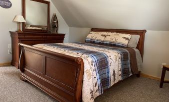- Main level bedroom: Has a beautiful queen sleigh-bed and comfortable pillow top mattress. This rooms has an a-joining door to the bathroom.