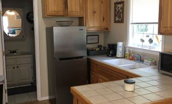 This cute and cozy cabin is set on the back of my property and overlooks the pond. It is a “tiny house” that my oldest son finished out to live in after college. It will only accommodate 2 people, but very comfortably. There is a full kitchen with a full sized fridge, a hot plate, microwave, and convection oven. It also has all cooking supplies and even several condiments and spices.