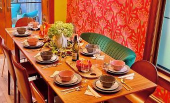 The fully stocked kitchen is perfect for home-cooked meals, featuring a chef-style gas range, convection oven, large island seating for four, and an expandable dining table for 8-10. We provide a selection of complimentary coffee, local refreshments, and treats to make your stay even more enjoyable.