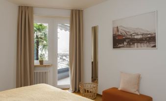 Ascona: Modern house "Palazzo Miralago", 4 storeys, built in 1960, renovated. 22 apartments in the property. Above Ascona 400 m from the centre of Ascona, in the district Lago Maggiore, in a quiet, sunny position on a slope, 400 m from the lake. In the house: reception, WiFi, lift, storage room for bicycles, central heating system, washing machine (extra), tumble dryer (for shared use, extra). Bread roll service possible. Parking (limited number of spaces, extra) on the premises, communal covered parking (extra). Parking space or garage only for small to medium-sized cars. Dimension: height 205 cm width 220 cm. Shop 400 m, grocery, supermarket 600 m, shopping centre 1.4 km, bakery, pedestrian zone 400 m, 10 minute walk to the centre, bus stop "Ascona Centro (Bus Nr. 1)" 400 m, railway station "SBB-CFF Locarno-Muralto" 4.7 km, sandy beach "Bagno Pubblico Ascona" 1.3 km, bathing lake "Lago Maggiore" 1.3 km, lake Lago Maggiore 500 m. Golf course (18 hole) 1 km, tennis 1 km. Nearby attractions: Madonana del Sasso, Orselina, Locarno-Ascona, Ronco sopra Ascona, Falconeria, Kamelienpark, Piazza Grande, Castelli di Bellinzona, Monte Verità, Ascona, Brissago Inseln. Well-known lakes can easily be reached: Lago Maggiore, Lago di Lugano, Lago di Como, Lago di Orta. Hiking paths: Monte Veritè, Ronco s. Ascona, Valle Maggia, VMonte Tamaro - Monte Lema, Monte Tamaro - Monte Lema. Please note: baby equipment on request (extra). Loading and unloading of baggage is possible at the holiday house. Additional accommodations can be booked. Property ref. CH6612.250.1-24 is situated on the same property. ATTENTION - limited number of garage spaces and limited number of outdoor parking spaces directly at the house - MUST reserve in advance. "Suite Modern", 2-room apartment 90 m2, south-east facing position. Renovated: living/dining room with 1 sofabed (160 cm, length 200 cm), satellite TV and radio. 1 large room with 1 double bed (200 cm, length 200 cm). Kitchen (oven, dishwasher, electric coffee machine, Capsules for coffee machine (Nespresso) extra). Bath/WC. Oil heating. Balcony, east facing position, small balcony. Marvellous view of the lake, the mountains and the resort. Facilities: Internet (WiFi, free). Please note: non-smokers only, non-smoking house. Maximum 1 pet/ dog allowed. NL-00004961