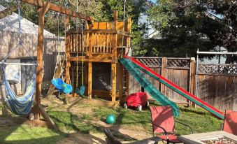 Enjoy movie nights under the stars with the outdoor projector, unwind on the deck, cook in the fully stocked kitchen, or stroll through Lithia Park just blocks away. Large fenced yard with play structure, barbecue grill, laundry, and off-street parking included. Pet-friendly for your furry companions!