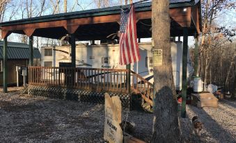 29’ camper with roof over and deck. Sleeps 4 comfortably. Gas forced air and central AC. Restroom and shower facilities are separate. Can use stove and oven. Water is not run through camper year round. 1 case of bottled water is provided or can use city water from shower house.About pets:Pets allowed: dogs (limit 2 total).About checkOut:Check out before 12:00 PM.About children:Children allowed: ages 0-17.About customRules:Please do no smoke inside any of the cabins or buildings..About checkIn:Check in after 4:30 PM.About smoking:Smoking allowed: in designated areas.About events:Events allowed: family gatherings.Maximum event attendees: 12.