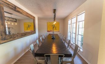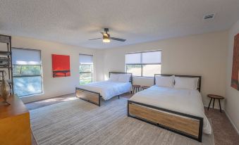 Welcome to your ultimate party pad near Downtown Austin! Newly renovated, sleeps 18 w/ 9 beds! This vibrant spot is perfect for big groups and events. LOADED w/ fun and games, custom paintings and hip furniture. TVs in every bed/ living room. Heated/ chilled stock tank pool, game room w/ arcades, turf sport court,and fire pit. Dining table seats 16. Kitchen stocked with essentials w/ Traeger grill for cookouts. Just a short walk to ACL! Very relaxed host experienced/ comfortable w/ large groups.About pets:Pets allowed: limit 4 total.About children:Children allowed: ages 0-17.About smoking:Smoking allowed: in designated areas.About events:Events allowed: family gatherings, birthday parties, weddings.Maximum event attendees: 50.