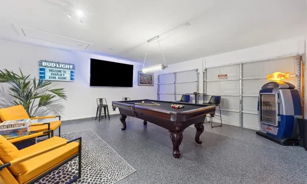 For relaxation and fun, the game room includes a dartboard, pool table, and a variety of board games. Unwind in the 2-person sauna or enjoy the heated pool and spa, complete with water features and massaging jets. The outdoor space is perfect for lounging, with pool recliners, daybeds, an outdoor sectional, and a propane BBQ grill. The backyard features pristine AstroTurf for a consistently green and clean environment.