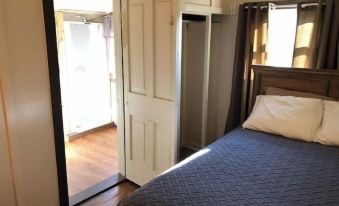 You can use the whole lot as well as walk or bike the campground. Fire pit in the backyard and wood available at our office. The bedrooms have curtain doorways and the bedroom walls do not reach the ceiling. This allows for heat and cooling circulation. Bathroom has shower, sink, and handicap toilet. The floors are wood but slightly uneven in places since it's an older cabin. The kitchen is small and simple with microwave, coffee maker, mini fridge and sink. The sun porch is a nice dining/work space.