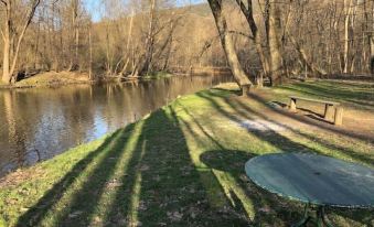 When you stay here you will have access to our property for a nice walk, fishing or kayaking in the river, a nice relaxing campfire or just exploring the countryside. This cabin is located towards the front of our campground by the road. You will have a small efficiency kitchen and two queen beds. You’ll have a short drive to Shawnee Park, downtown Bedford shopping and several restaurants.