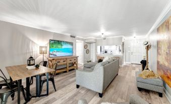 The expansive living room has a convertible couch-bed that sleeps two, large wall mounted smart TV, two chairs for the breakfast bar as well as a dining table with sitting for four. From the living room you’ll find a full washer and dryer to take care of laundry needs. The large bathroom offers two separate vanities and walk-in shower.