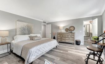 The sizable bedroom has a king bed and dresser with plenty of storage space. There is also a wall mounted fold-out workspace with stool. Additionally, a walk-in closet with new closet system provides additional storing area and full body mirror.