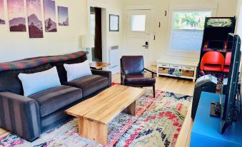 - Living Area: A perfect mix of retro fun and modern entertainment with an arcade game with 50+ games, board games, and a smart TV for movie nights. The living room also includes a comfortable queen-size foam mattress hide-a-bed in the couch.