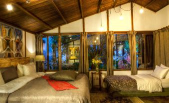 This is the place for anyone that loves good food, comfy accomadations, lovely gardens and to be surrounded by art. We stayed here with a large group of family members, including a young toddler. The owners and staff are so friendly and accomadating. You can also just come for a meal but I would make a reservation. The food is world class with all fresh ingredients and made to order meals. It is a place to enjoy a long, peaceful meal, nothing frozen or prepared ahead of time. Order the yummy cocktails and appetizers to make your time more enjoyable. The passionfruit, watermelon gin and tonic was the best cocktail I ever had. We also loved our meals and the desserts, everyone in our large group thrilled with their choice, all saying theirs was quite yummy. We found the prices to be extremely reasonable for the high quality service, ingredients and deliciousness. The rooms are all differen and quite unique, filled with original art and also windows that have views of their natural gardens. The oversized, king beds are so comfortable, we had our best night's sleep here. The pitter patter of rain drops on the opaque bathroom roof lulled us to sleep. I also enjoyed the natural lighting of the modern bathroom which is supplied with local products. The price is very good for the quality you reciever here, with the friendly staff and beautiful atmosphere. The hotel is high above the city which allows for some beautiful views as you go up. It was quiet and peaceful. There is free parking within the walled and gated hotel compound. The owner speaks English so it was easy to communicate with him about the booking and also the meals. The staff was so friendly, paying sweet attention to the toddler who loved it. Our whole group expressed delight with this hotel and restaurant. Our breakfast was again delicous, with fresh fruits and yoghurt and meals made to order. Also, of course, was the delicious Columbian coffee we've truly enjoyed and are now addicted to. Yum! We all thought this place would make a great site for a destination wedding or family gathering. And to top it all off fresh roses abound, with vases in every room and all over the hotel. Its sensory delight to be here. We will definitely be back. This is indeed a special place.