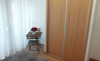 The bedroom area has a wardrobe, a bed with a very comfortable mattress, 1.60x1.90, and an iron.
