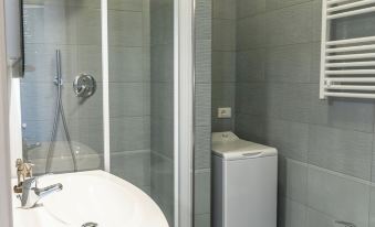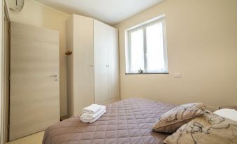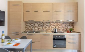The apartment, located on the second floor of a 4-story building with an elevator, is fully air conditioned and consists of a living room with an open kitchen, dining table and sofa (convertible into a second double bed), a bedroom with a double bed and a bathroom. The kitchen and bathroom are complete with everything. The first offers induction burners, formo (also microwave) and dishwasher, and of course fridge and freezer. The second is a bathroom with wall-hung fixtures (toilet and bidet) and a nice shower stall. It is here that the washing machine is also located.