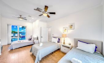 Antique / Vintage style Florida home! Bedroom one boasts a king bed with nightstands, a desk, and chair, a walk-in closet, a full-size balcony with water views, a smart TV, a walk-in shower, and a luxurious Jacuzzi bathtub. Bedroom two includes a king bed, a smart TV, a closet, a walk-in bathroom and shower, a balcony, and a cozy seating couch. Bedroom three offers a king bed with nightstands and closets, while bedroom four features a queen bed, nightstands, closets, and a dresser. Bedroom five is perfect for a family or group, with a queen bed and two single beds, along with nightstands and closets.