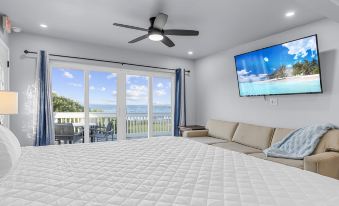 This upstairs oceanfront duplex, which is one of two spaces available for guest stays, features a fully equipped kitchen that is perfect for cooking meals during your stay. Enjoy your freshly prepared meal at the dining room table or dine outside while you enjoy the ocean breeze. Relax and stretch out in the spacious living room, featuring a big screen TV's and large sectional sofa, providing plenty of space for everyone to enjoy movie night.