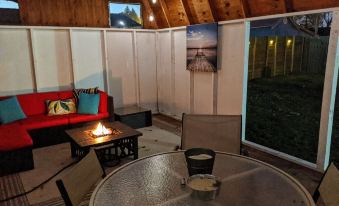 Walking out the sliding door into the covered porch, you’ll find a fully fenced in backyard, gas and wood fire pits, 4 person hot tub and converted barn to gazebo with solar lighting for the dining table, sofa seating, and gas grill. Corn hole, ladder ball and darts are provided for your enjoyment.