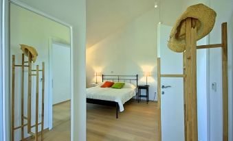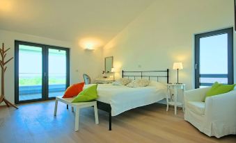 The four spacious bedrooms in the villa can comfortably accommodate up to 10 people. All bedrooms have French double beds and each has its own bathroom. Three of the bedrooms have direct access to the covered terrace, with a view of the sea over the hilly landscape. The “gallery bedroom” with two double beds is perfect for families with children.
