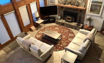 Deerfield Resort is a gated community with a wonderful golf course, tennis, pickleball, swimming pool and other amenities. 900 acres of beautiful walking to enjoy spectacular views. Just outside the main gate is a comfortable winery (voted Tennessee’s best boutique winery in 2024). There is really something for everyone. Our master bedroom on the main floor has a very comfortable king bed. The connected master bathroom has a jacuzzi tub with lake view and, a separate walk in shower. There are 4 queen bedrooms with new mattresses. Two are on the top floor, and two on the bottom floor. One on the top has an attached bathroom, the other bathroom is off the hall. The two on the bottom floor share a double room bathroom at the end of the hall. There is a full sized open bedroom on the balcony over the living room which has two twin futons and a privacy curtain. It comes with a full closet, night stand, dresser ,etc. We chose to have this room open for its view of the main room and lake. There is another twin futon located in an open alcove down the hall on the top floor. There are also two adult accommodating European style futons in the lower main room. In all we have four full baths and two half bathrooms.
