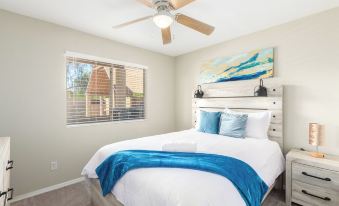 Enter a luxurious sanctuary in the primary bedroom, offering a sumptuous king-size bed dressed in premium linens. You'll feel like you're drifting off to sleep on a pillow of clouds! If you simply can't miss your favorite late-night talk show, you'll love the wall-mounted TV. Prefer a few pages of your book before retiring? The nightstands with drawers and lamps are perfect for you. Don't forget to charge your phone with the bedside charger.