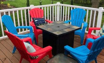 House has 3 bedrooms: 2 have queen beds, and one has twin over double bunk. Includes WiFi and TV with Roku for streaming. Huge deck off family room has table and chairs, a gas grill and a gas fire pit perfect for s'mores in the evening. Private side deck off primary bedroom is great for enjoying your morning coffee or a glass of wine in the evening. Fully equipped kitchen with island that seats 4 and dining table for up to 6. New appliances including full sized washer and dryer. Home has central air and heat, ceiling fan in family room. Two bathrooms: one with claw foot tub only, other with tub/shower combo.