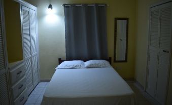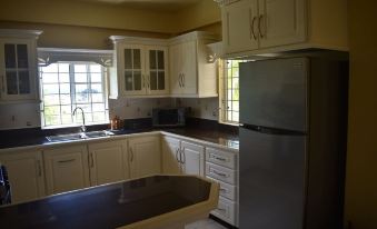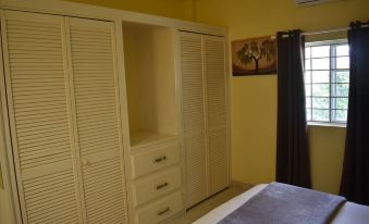 This accommodation is airy and comfortable with a combination of ceiling fans and large louvered windows. White French doors extend into the patio furnished with comfortable outdoor furniture.