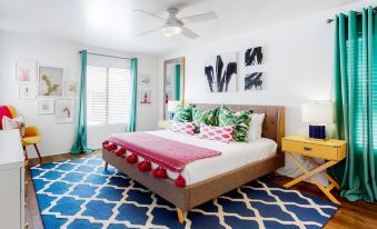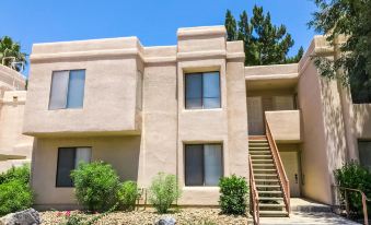 You will quickly fall in love with this vibrant and upgraded, modern condo in Cathedral City, right between El Paseo and downtown Palm Springs. This spacious, second-floor getaway is furnished with mid-century modern decor and adorned with bold, original artwork. Prepare anything from your morning coffee to full-course dinners in the well-equipped kitchen complete with select stainless steel appliances and a breakfast bar. Dine together at the table for six, and then settle into the inviting and colorful living area complete with a large, smart flatscreen TV, or step outside onto the furnished balcony overlooking one of this complex' five heated pools. Guests can play on the tennis courts, work up a sweat in the fitness room, or just take a stroll around the landscaped grounds.