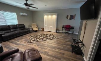 Equipped with a Queen size Murphy Bed to maximize living space, recliner couch, additional recliners with ottomans, a large bathroom with walk-in shower and kitchen with full-size fridge, microwave, Keurig, and toaster. Enjoy the huge back porch/patio while grilling or just sitting around the fire pit.