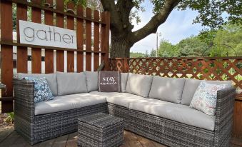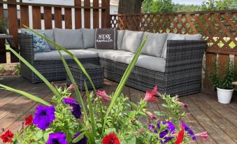 Enjoy 200' of Rapid River, waterside deck and bridge. Kick back and take a nap on an oversized couch or eat dinner at the outdoor dining table. Listen to the river while roasting a marshmallow at the fire-pit with large Adirondack chairs. We’ve got you covered with firewood too!
