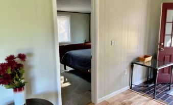 Roku T. V., hardwood floors, loveseat, chair, ceiling fan, slider to backyard, wood stove, heat, & AC.