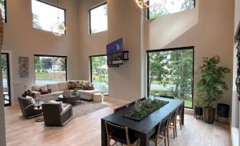 Upon entering the home you step into Sala Grande, the Great Room, under a twenty-two foot tall ceiling highlighted by a gorgeous natural wood beam, and you are surrounded by nine massive windows along three walls! On your right is a beautiful quartz waterfall island that seats six. To your left is a warm and inviting sectional sleeper sofa and accent chairs that can easily be moved to make sure you have the best view of the 86” wall mounted TV. Finally, you’ll be drawn by the gorgeous solid ash custom dining table that easily and comfortably sits eight!