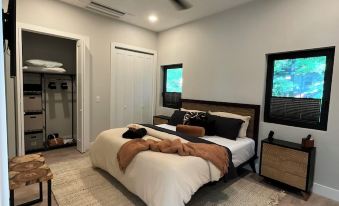 Each bedroom has its own name and theme. The master bedroom downstairs is “Beach Vibe” and is a tribute to our love of the ocean and world travels to amazing beaches and scuba dive adventures. The master bathroom has twin backlit mirrors that resemble full moons on the black tile wall to guide the young sea turtles back to sea. :)