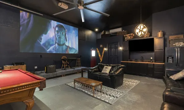 Game Room: 1,000 sq ft with bar, full refrigerator, projector screen, popcorn machine (starter popcorn included), pool table, poker table, karaoke, piano, and full bathroom.
