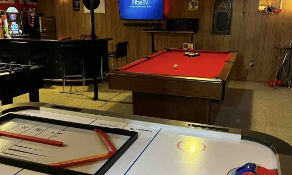Bar/games room include: pool table, wheel of fortune, fooseball table, darts, air hockey table (which can also be a beer pong table), basketball, cards, tv with cable and internet, a 2nd fridge for drinks or food. Also includes 1 bedroom with a full ensuite bathroom and laundry room