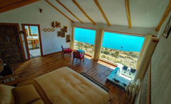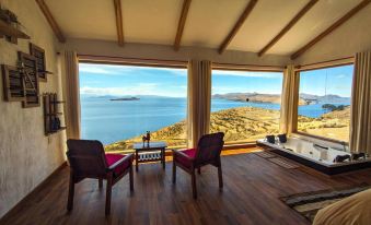 Environment Location: The location is away from the harbour town, providing a peaceful and tranquil environment with spectacular views of Lake Titicaca, such as from the room where one can enjoy sunrise over the lake.