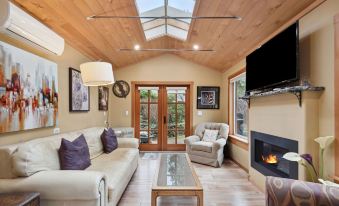Follow the path through the beautiful garden that will lead you to the suite. Open the french doors and step into the living room featuring an electric fire place, tv, comfy lounge furniture. Through the living room you will find the full kitchen, dining area and dedicated workspace. The queen bedroom has ample closet space and french doors to keep the bedroom private from the rest of the suite. There is access to the shared washer and dryer for use as well as an ironing board.
