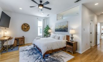 • Guest bedroom (nearly 250 square feet) with ensuite bathroom with a deep bathtub ideal for soaking. The room also has a King Casper mattress, a 6-drawer dresser, a desk with a chair, a full-length mirror, and a 55-inch TV. Premium window treatments for complete control of privacy and lighting in the room.
