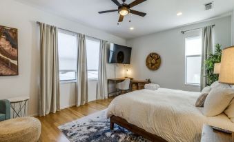 • Bedroom with a Casper queen bed, full-size dresser, 55-inch TV, and premium window treatments.