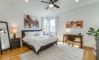 • Master bedroom (nearly 300 square feet) with ensuite, 2-sink bathroom, and a sizeable double hallway closet. King bed with a Casper mattress and premium bedding. The room has a 65-inch TV, a dresser, a chair for reading, a full-length mirror, and another desk with a chair for working. Premium window treatments for complete control of privacy and lighting in the room.