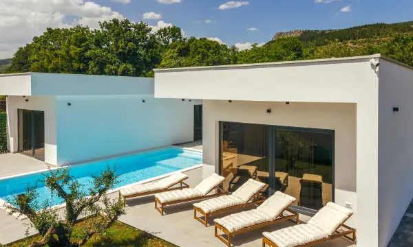 Donji Proložac 5 km from Imotski: Modern, beautiful villa "Olive", built in 2024. In a quiet, sunny position, 38 km from the sea, in a cul-de-sac. Private: property 1'500 m2 (fenced), swimming pool angular, heated (9 x 4 m, depth 150 cm, seasonal availability: 01.May. - 01.Oct.) with internal staircase. Terrace (40 m2), garden furniture. In the house: internet access. Parking (for 4 cars) at the house on the premises. Shop 500 m, restaurant 2.5 km, bus stop 4.3 km, pebble beach 38 km. Well-known lakes can easily be reached: Modro jezero 5 km, Crveno jezero 5 km. Swimming pool with hydromassage. 5-room villa 200 m2, south facing position. Beautiful and modern furnishings: living/dining room 70 m2 with 1 double sofabed (140 cm, length 200 cm), satellite TV (flat screen), air conditioning. Exit to the terrace, to the swimming pool. 2 rooms, each room with 1 french bed (160 cm, length 200 cm), shower/WC and air conditioning. 2 rooms, each room with 1 french bed (160 cm, length 200 cm), air conditioning. Open kitchen (oven, dishwasher, 4 ceramic glass hob hotplates, microwave, freezer, electric coffee machine). Shower/WC, sep. WC. Heating. Terrace furniture, deck chairs (5). View of the swimming pool. Facilities: washing machine, children's high chair, baby cot, hair dryer. Internet (WiFi, free).