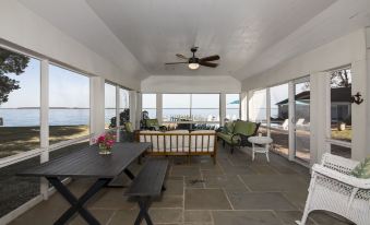 Three-sided screened porch overlooking water, with sofas, chairs and dining table