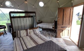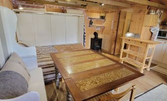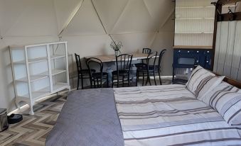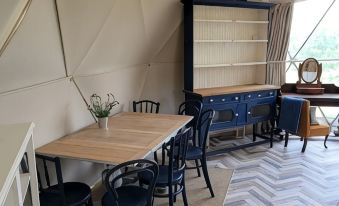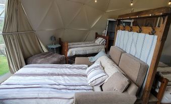 The lodge contains a pull down double murphy bed, a dining area with kitchen and separate shower room with toilet and sink. Next door is the dome, with a lounge and dining area, a Double bed, single bed and sofa bed. (an extra single bed is available on request)