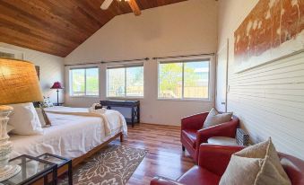 Step inside and discover a thoughtfully designed interior featuring a gourmet kitchen with brand-new appliances, a cozy dining area for four, and a comfortable living room with an electric fireplace and flat-screen TV. Streaming is a breeze with Netflix and Pandora ready to go. Two beautifully appointed bedrooms await—a spacious master with a plush king bed and wall-to-wall windows that fill the room with natural light, and a second cozy bedroom with a queen bed and direct access to the bathroom. The deluxe bathroom features a tiled standing shower, pedestal sink, generous vanity, and soft, luxurious towels. A dedicated laundry room adds extra convenience for longer stays.