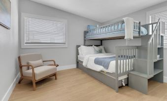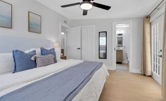 The bedrooms at "Coastal Cabana" are adorned with premium linens, ensuring a comfortable and restful night's sleep. With a king bed, a full bed, and two twin beds, there is ample space to accommodate all guests. The master bedroom also features a flat-screen television and an en-suite bathroom for added convenience. An additional full bathroom is located in the hallway.
