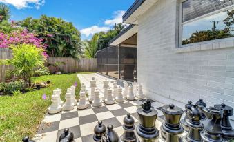Venture outside to your private patio, where you'll find the inviting pool surrounded by lush tropical landscaping. Take a seat at the outdoor seating area, fire up the barbecue, and savor a delicious meal in the open air. The pool area provides seating for six and recliners for sunbathing, allowing you to unwind in style. Additionally, there is an oversized chess game for some friendly competition and a game room featuring air hockey and a foosball table, perfect for indoor entertainment. The home also offers a TV for those who wish to catch up on their favorite shows or watch the game.