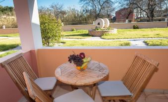 Erikousa Villas are located 8 nautical miles from Corfu in Erikousa Island. The complex consists of 7 semi detached two store villas which each one cover s a surface of 45sqm and can accommodate up to 4 guests. The villas are in a fenced plot in the square of ‘Porto’ in Erikousa. On the ground floor there is a small kitchen with basic facilities for cooking with dining table, a shower with cabinet enclosure and a living room with sofa bed that can transform into double bed. An interior staircase leads to the upper floor to the master bedroom which features a double bed and has access to a beautiful balcony overlooking the square and the garden.