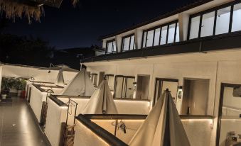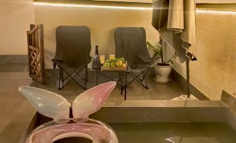 總共5間房,粗看裝修配置都是一樣的。一樓小院裏有温泉泡池,客廳和衞生間,二樓卧室,有空調。稍大一些的游泳池在公共區域。1-5號房,5號在最裡麪私密性最佳,需穿泳衣泡。哪個房間便宜定哪個就行。