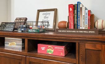 Head downstairs to access our second living room. Here, you'll find a large sectional, two lounge chairs, a 65-inch Roku TV, a desk area, a bar cart, a karaoke machine, an arcade game console and lots of boardgames! This is our favorite place to unwind after a long day out and about in NWA.