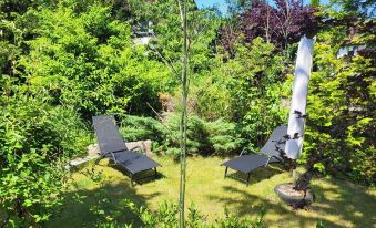 Kleine Terrasse im Garten (Jeweils eine pro Wohnung) mit Sonnenliege und Stühlen.
