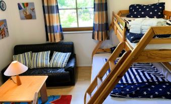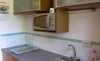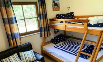 In the fenced private garden with a mostly covered south-facing terrace, comfortable garden furniture and a garden shed, there are sun loungers including a parasol and a charcoal grill. The sun loungers are portable and you are welcome to take them to the heated swimming pool and natural bathing pond. The garden or the garden house also serve as a storage space for bicycles, ski equipment, etc.
